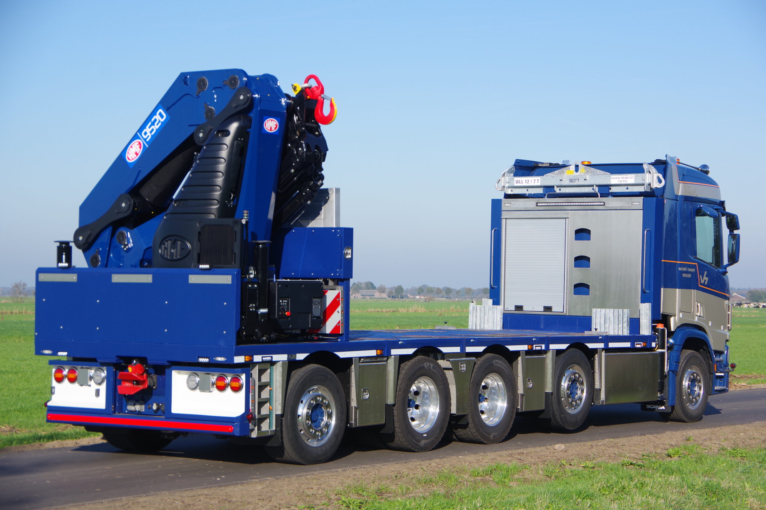 49T SCANIA 10×4 2e en 5e as verschoven met HMF 9520 voor Van Hooft Transport