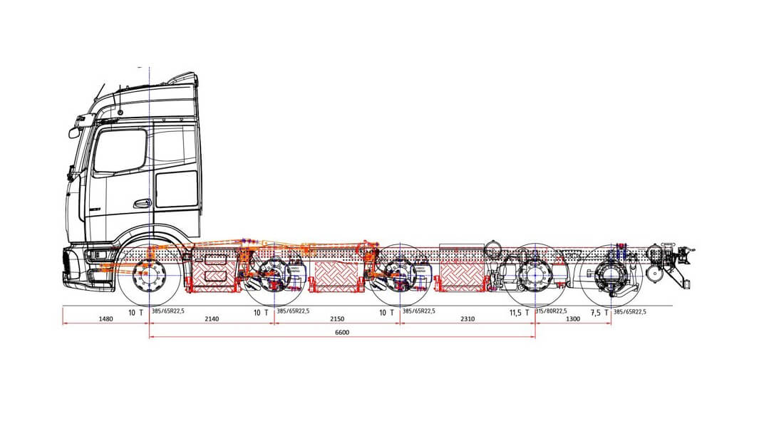 Onderdelen voor: Ombouw Mercedes E-Actros 600 6×2 naar “VELDHUIZEN TRUCKS” 10×2 midlift (49,0T)