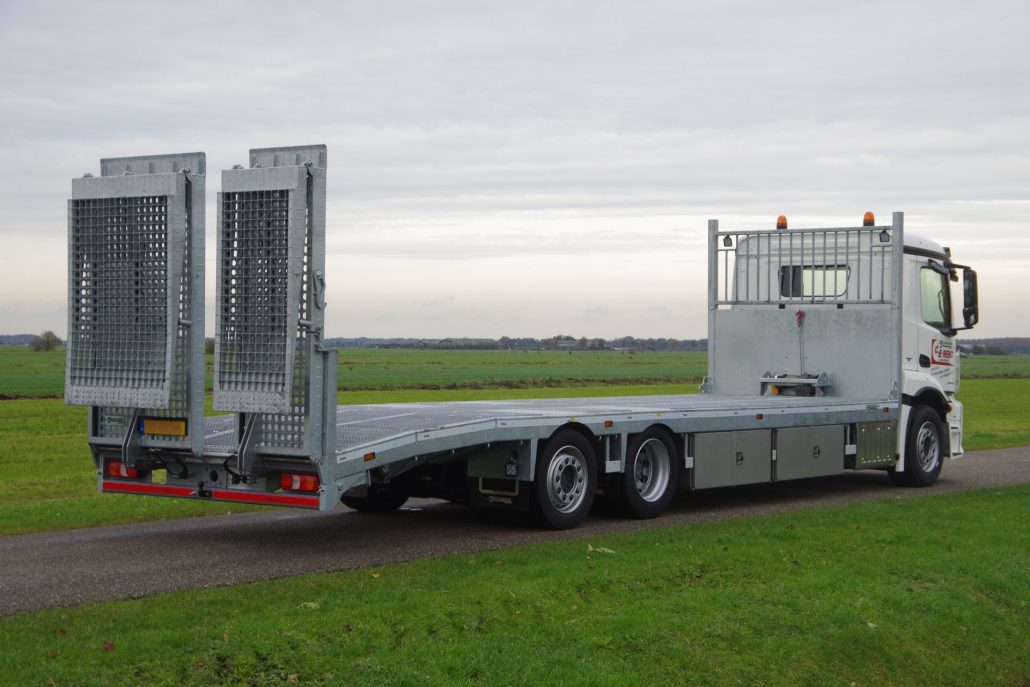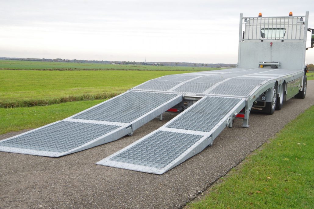 – 2 dubbel opvouwbare oprijkleppen ± 4,00 mtr. lang van “Domex” roosterprofiel (max. wiellast 4.000 kg) (rechter klep 0,80 mtr. breed i.v.m. giek)