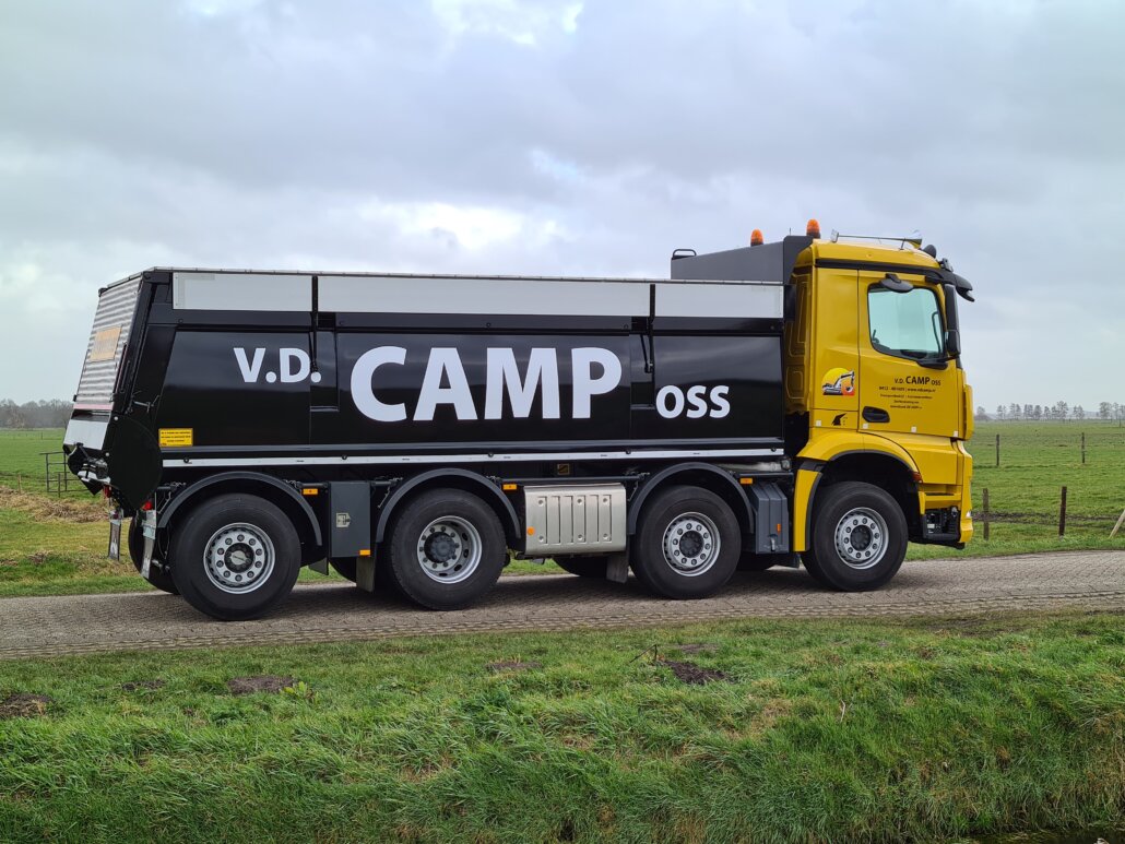 – wielbasis inkorten van 4,25 mtr. naar 3,95 mtr. (as 1 as 3) en uitlaat naar voren en hoger plaatsen aan chassis (komt ± 210 mm boven het chassis uit)