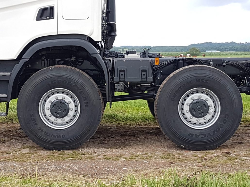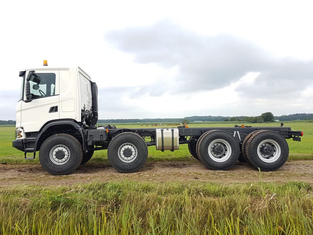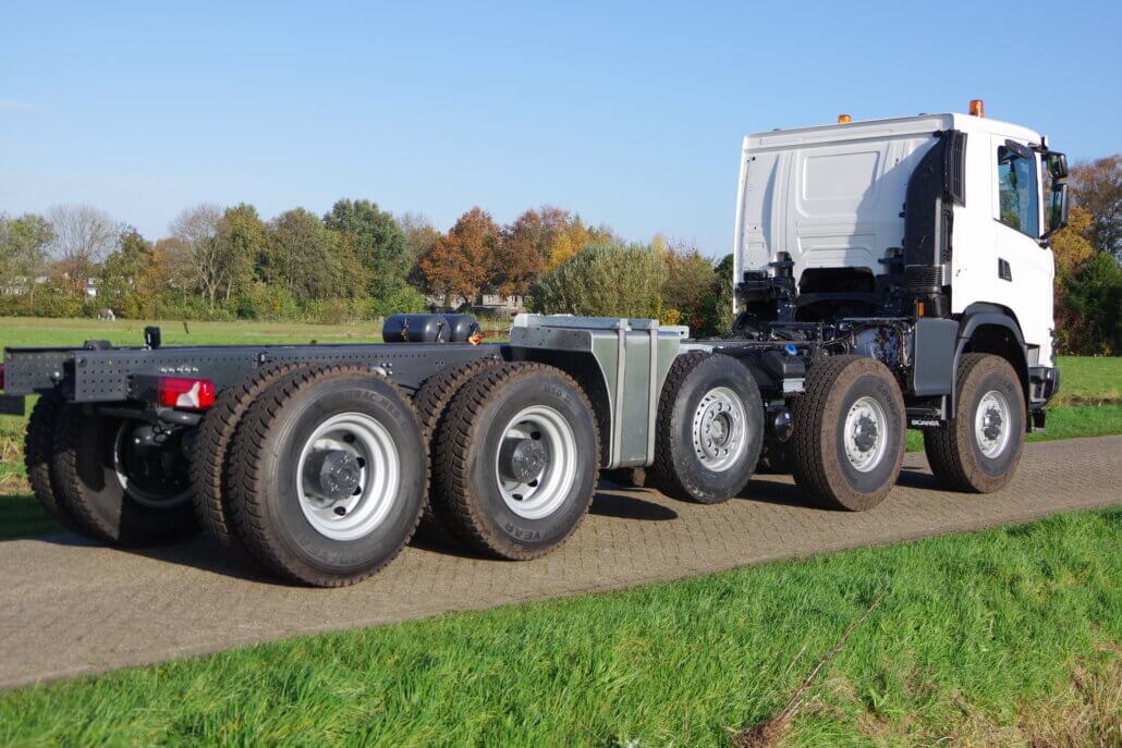 Ombouw Scania XT 8×8 naar 10×8 met 10,0-tons gestuurde tussen as (49,0T).