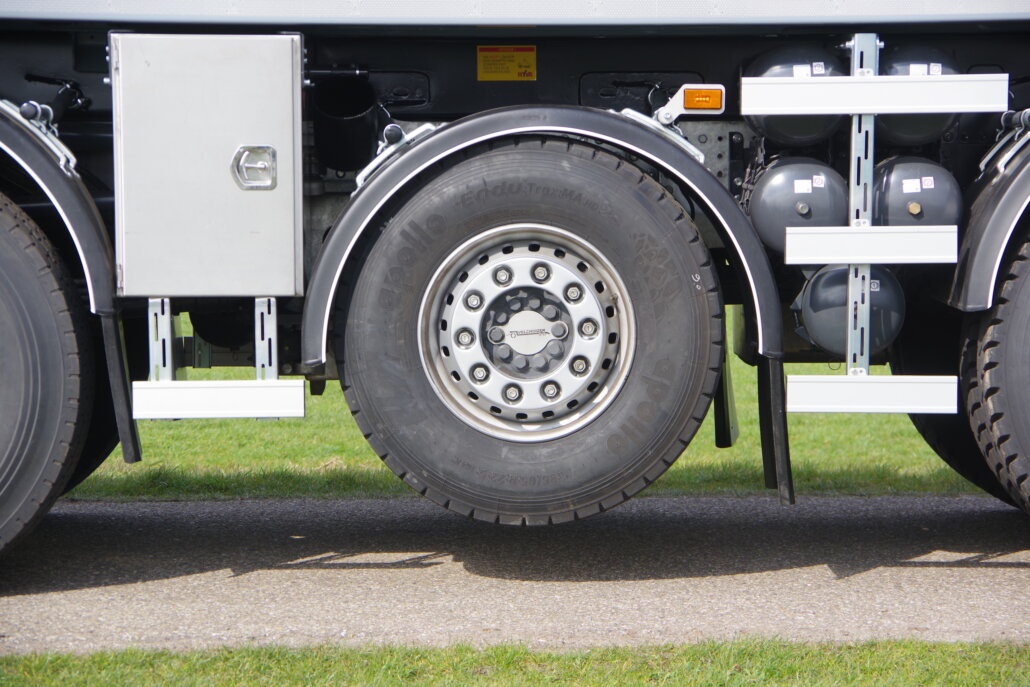 – voorbanden wisselen van 385/65R 22,5” naar 375/90R 22,5”