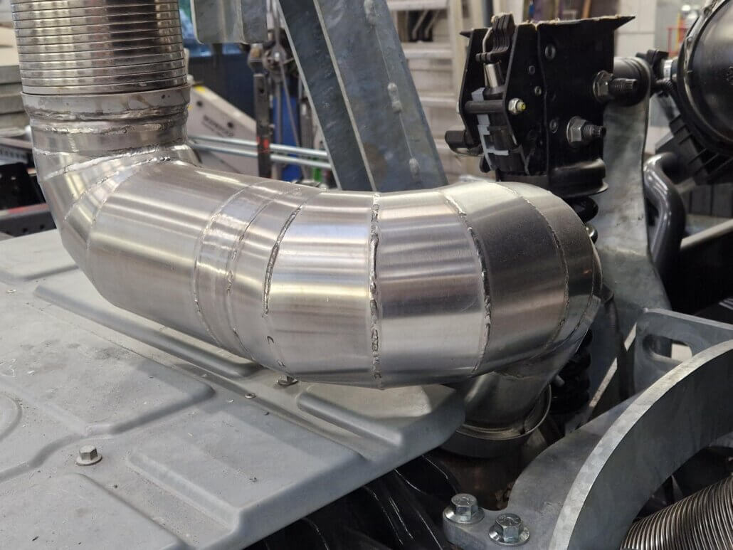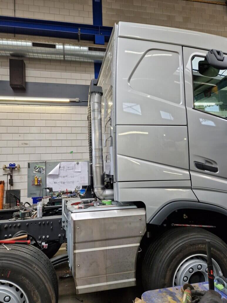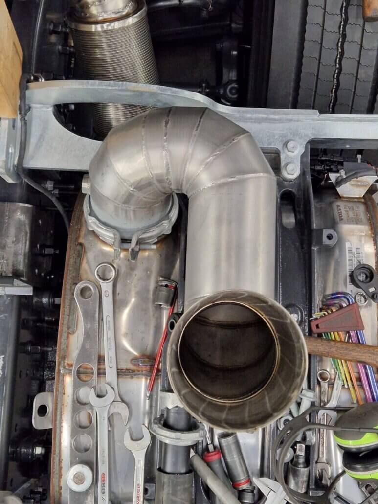 – uitlaat aanpassen zodat de staande pijp achter de cabine komt