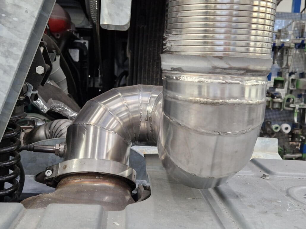 – uitlaat plaatsen naar voren en hoger plaatsen tussen 1e en 2e as (± 300 mm boven chassis)
