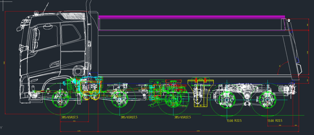 – D13A 13.00R22,5“ band, aangedreven as (i.c.m. 425/65R22,5” op de vooras)